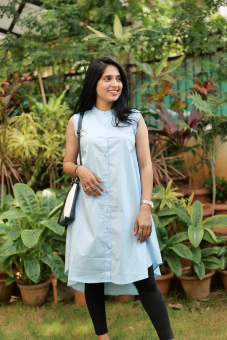 Ice Blue Cotton Frock with Front Open Design & High Waist Fit