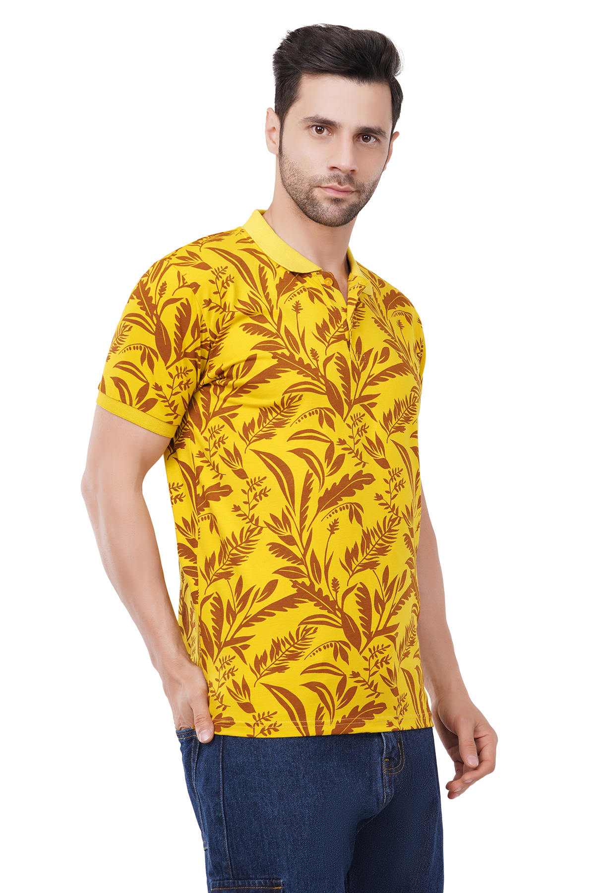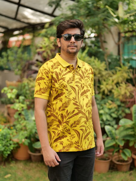 Add a touch of nature to your wardrobe with this cool mustard polo featuring a stylish leaf pattern. Perfect for both laid-back weekends or casual days at work, this tee gives you comfort and style in one easy piece. Light, breathable, and just the right fit.