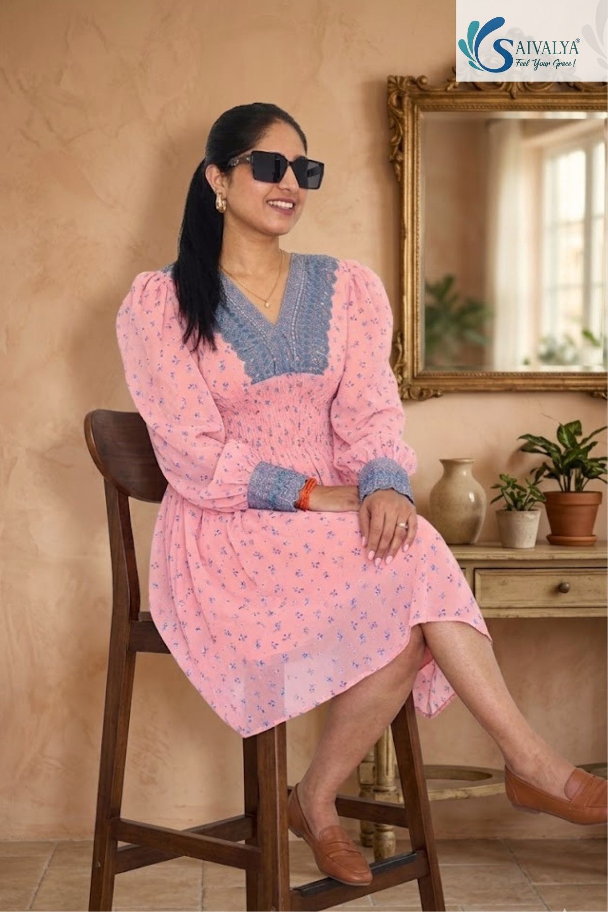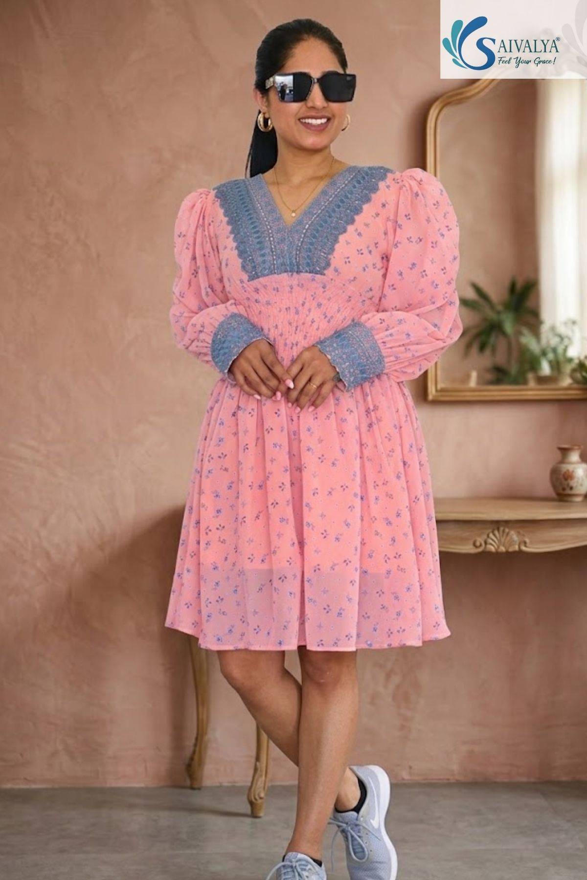 - Layering for Evenings: Throw on a light denim jacket or a solid blue pashmina stole to stay warm without hiding the dress’s floral charm.