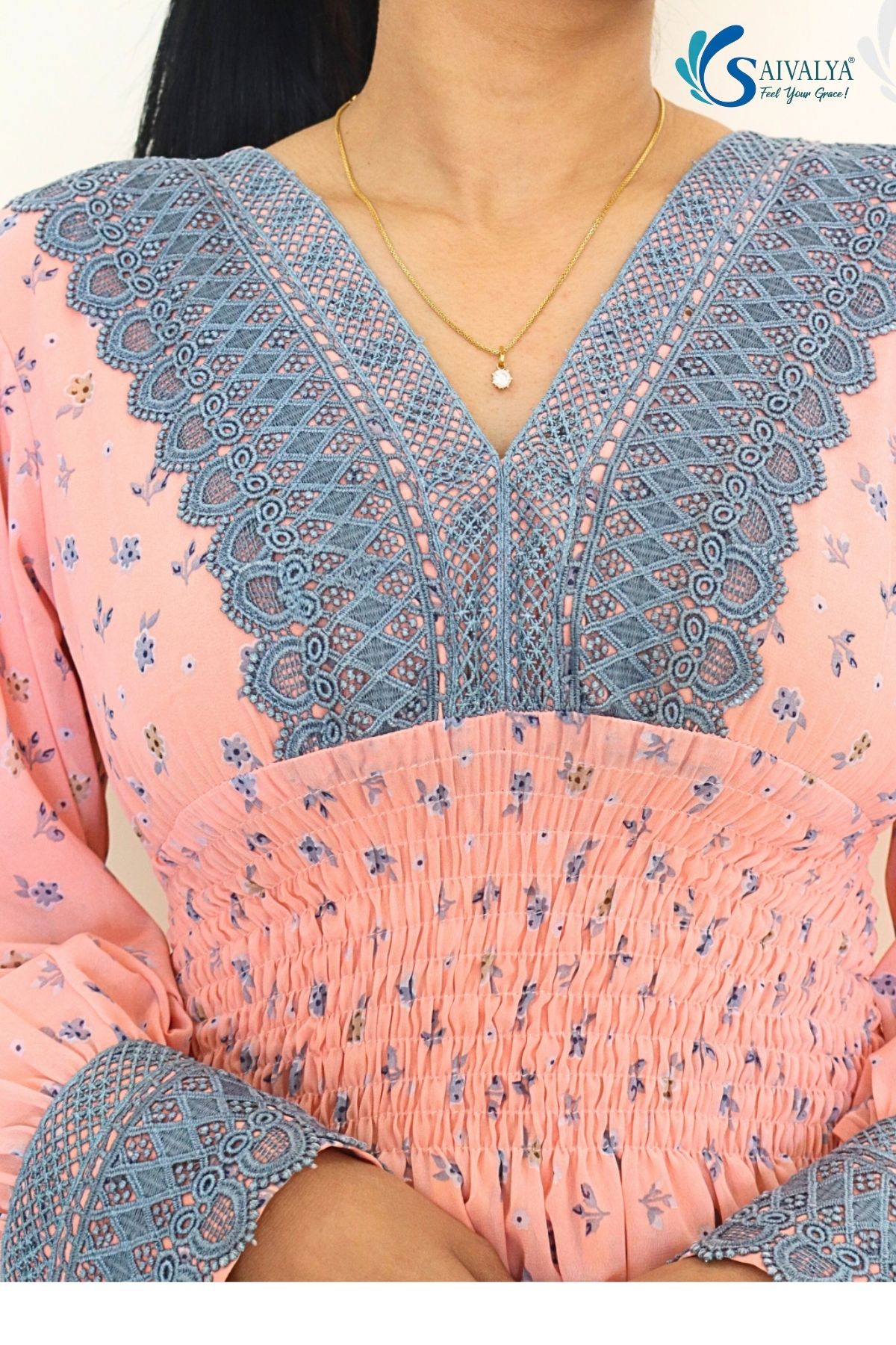 - Intricate Blue Lace Yoke: A stunning V-neckline framed by wide, embroidered blue lace that adds a touch of traditional craftsmanship.