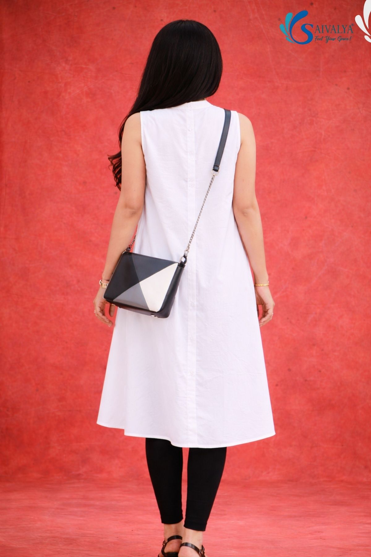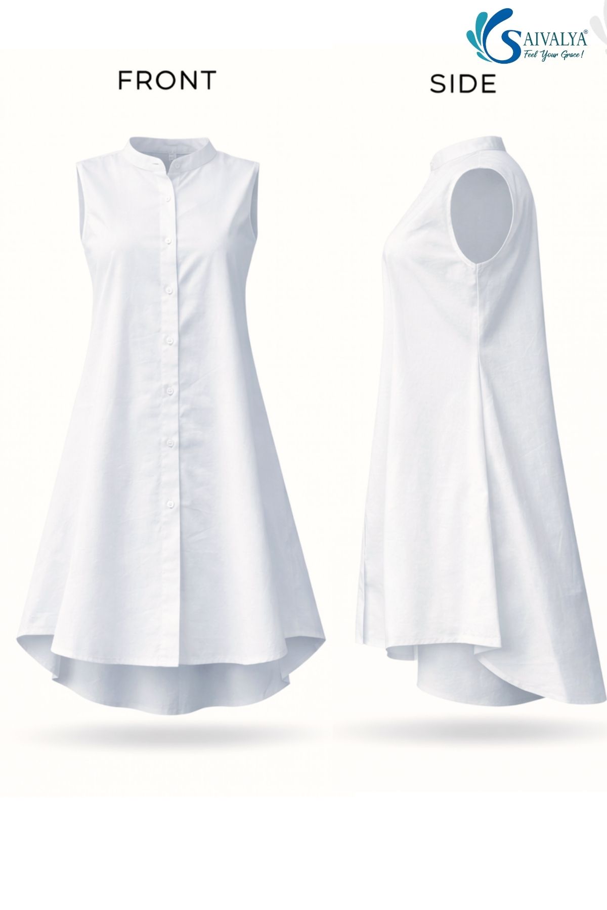 Refresh your summer wardrobe with our Pure Aura White High-Low frock. Carved from premium organic cotton, this sleeveless button-down frock features a sophisticated mandarin collar and a fluid asymmetric hemline. A timeless piece that defines crisp, organic elegance for the modern woman. Both side pockets add functionality to frock.